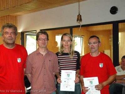 Wer dann immer noch nicht ausgepowert war, ließ sich den Sportlerball am Abend sicher nicht entgehen. Tanzbares gab es von der Band „Blank“ zu hören und ein Höhenfeuerwerk rundete den gelungenen Tag ab. Bei Texten wie „Marmor, Stein und Eisen bricht, aber der SV Glienicke nicht“ sorgte die Gruppe „René und Schenk“ – zusammen mit Kassenwart Joachim Gonther am Mikrophon – bis in die Nacht für ausgelassene Stimmung. Karl-Heinz Krüger, seines Zeichens Abteilungsleiter der Sportschützen, hatte sogar eigens für das Jubiläum zu Papier und Feder gegriffen und ein Lied komponiert. Der Aufruf hierin darf wohl als richtungsweisend für die Zukunft des Vereins, der an neuen Mitstreitern stets interessiert ist, gelten: „Komm, sei nicht träge, mach Sport beim SVG – komm, sei nicht träge, pack‘ es an!“